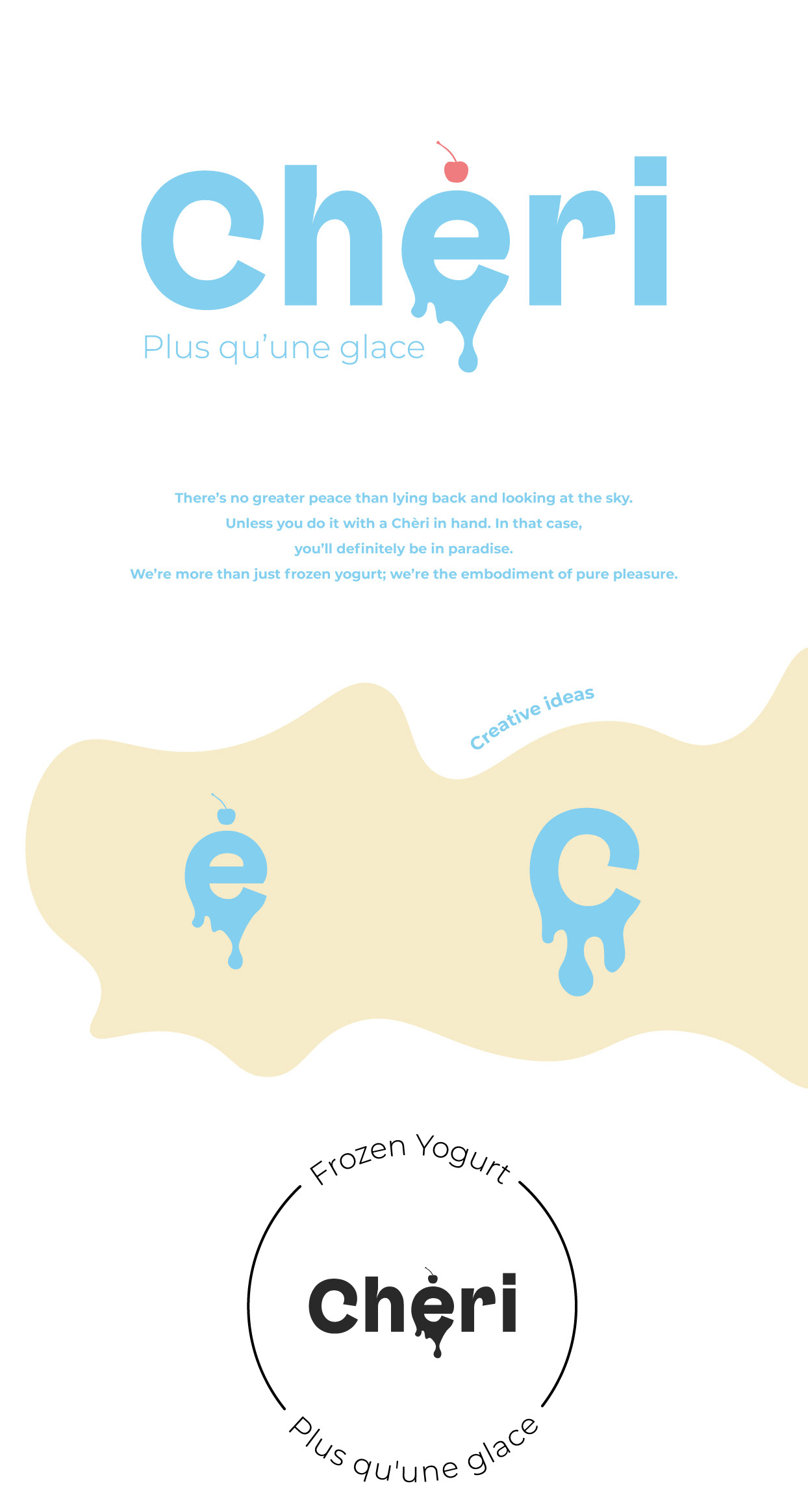 Chèri is a unique frozen gelato spot based in Houston. The name "Chèri," inspired by the French word for "darling," sets the tone for a warm and welcoming treat experience. Instead of a café vibe, we’ve shaped Chèri as a little slice of Parisian charm, where guests can enjoy not just a delicious yogurt gelato but also a culturally rich atmosphere. We highlight the space with elegant illustrations and fun facts about French culture—whether it's cinema, art, or general trivia. Every visit becomes a little cultural escape. Our audience is anyone who loves a visually delightful space and wants to savor a sweet, beautifully decorated environment that’s perfect for photos and relaxation. In essence, Chèri is all about combining the joy of frozen yogurt gelato with a touch of Parisian elegance, using fresh colors like soft blues, vibrant pinks, and creamy beige tones to create a fun and inviting atmosphere.